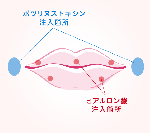A:唇にヒアルロン酸を注入してふっくらと形を整えます。口角にボツリヌストキシンを注入することで口角があがり自然とほほ笑んでいる形を目指す施術です。