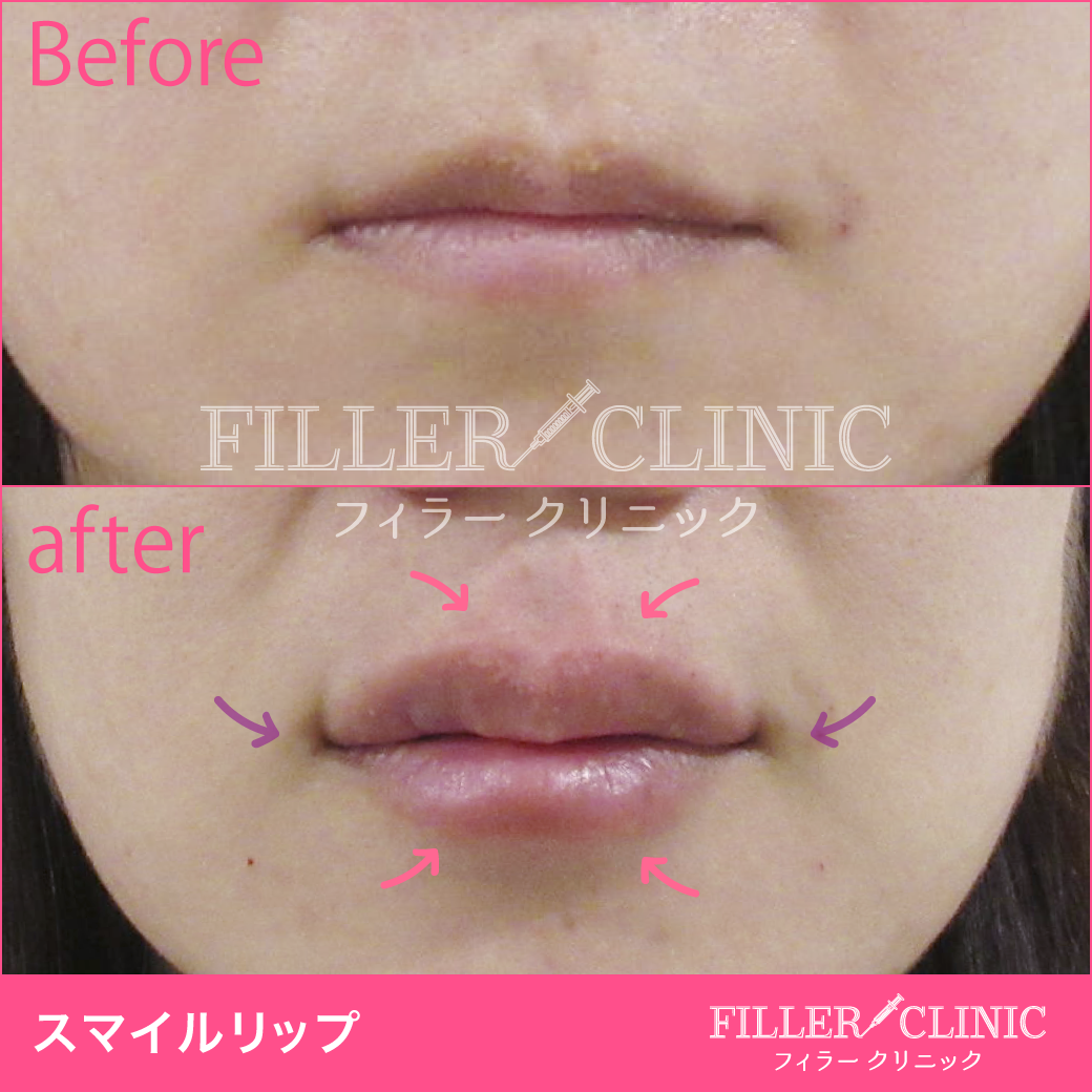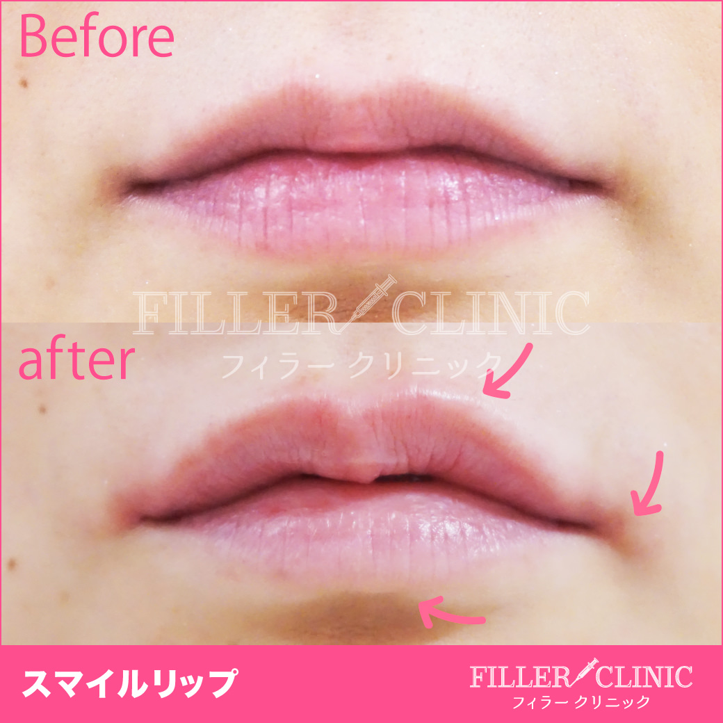 A:唇にヒアルロン酸を注入してふっくらと形を整えます。口角にボツリヌストキシンを注入することで口角があがり自然とほほ笑んでいる形を目指す施術です。